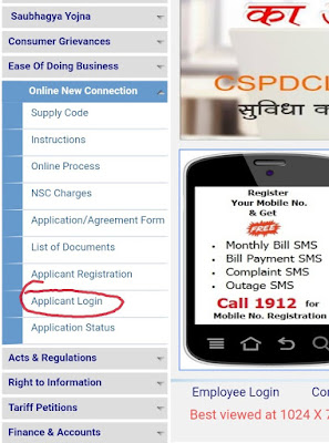 लॉगआउट हो जाने के बाद पुनः online new connection को क्लिक करना है अब एक लिस्ट खुलेगा जिसमें applicant login को क्लिक करना है जैसा कि स्क्रीनशॉट द्वारा दिखाया गया है।