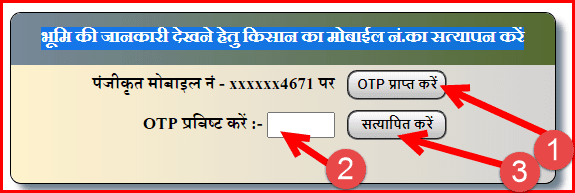 स्टेप 5. यदि आप पंजीकृत भूमि के बारे में जानना चाहते हैं तो ठीक इसके नीचे दिए कालम में otp प्राप्त करें के इंटरफेस पर क्लिक करना है ,जिससे पंजीकृत मोबाइल नंबर पर otp प्राप्त हो जायेगा ,otp प्रविष्ट करें के इंटरफेस पर otp दर्ज कर सत्यापित करें पर क्लिक करना हैं ,जिससे पंजीकृत भूमि का खसरा नंबर शो होने लगेगा ,जिससे आपको कन्फर्म हो जाएगा कि आपने कौन कौन से खसरा नंबर की भूमि का धान बिक्री हेतु पंजीयन कराया हैं।