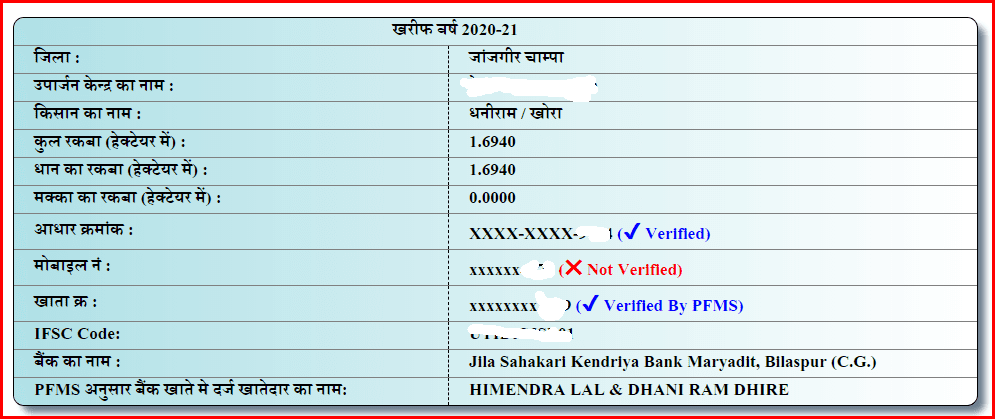 स्टेप 4. इस प्रकार आपका पूरा डिटेल शो होने लगेगा। आप जिला ,उपार्जन केंद्र , नाम ,रकबा ,धान का रकबा ,आधार नंबर ,मोबाइल नंबर ,खाता क्रमांक ,ifsc कोड ,खाता धारक का नाम देख पाएंगे ,यदि आधार नंबर मोबाइल नंबर तथा खाता क्रमांक चेक कर सकते हैं ,यदि आधार नंबर ,मोबाइल नंबर और खाता क्रमांक verified नहीं है तो वेरीफाई करा लें।