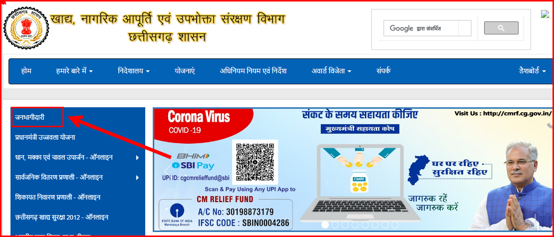 स्टेप 2. अब इस वेबसाइट का home पेज खुल जाएगा ,home पेज पर आपको नीले रंग के बैकग्राउंड में जनभागीदारी ,धान ,मक्का एवं चावल उपार्जन ,सार्वजनिक विरतण प्रणाली आदि का इंटरफेस दिखाई देगा ,आपको जनभागीदारी के इंटरफेस पर क्लिक करना है ।