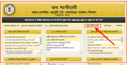 स्टेप 3.अब जन भागीदारी खाद्य ,नागरिक आपूर्ति एवं उपभोक्ता संरक्षण विभाग,छत्तीसगढ़ शासन लिखा पेज खुल जाएगा। आप इस पेज में राशन कार्ड ,धान खरीदी ,सार्वजनिक वितरण प्रणाली से संबंधित जानकारी प्राप्त कर सकते हैं। आपको इस पेज में स्क्रीनशॉट द्वारा दिखाए गए अनुसार sms पंजीयन करें के इंटरफेस पर क्लिक करना है।