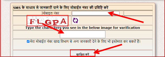 स्टेप 5 .अब फॉर्म के निचे वाले भाग में मोबाइल नंबर दर्ज करने के इंटरफेस पर मोबाइल नंबर दर्ज करना है तथा कैप्चा नंबर को सेम टू सेम दर्ज करना है। अंत में सबसे निचे भाग में दिए सुरक्षित करें के इंटरफेस पर क्लिक करना है जिससे मोबाइल नंबर रजिस्टर कर लिए जाने का नोटिफिकेशन प्राप्त हो जायेगा ।