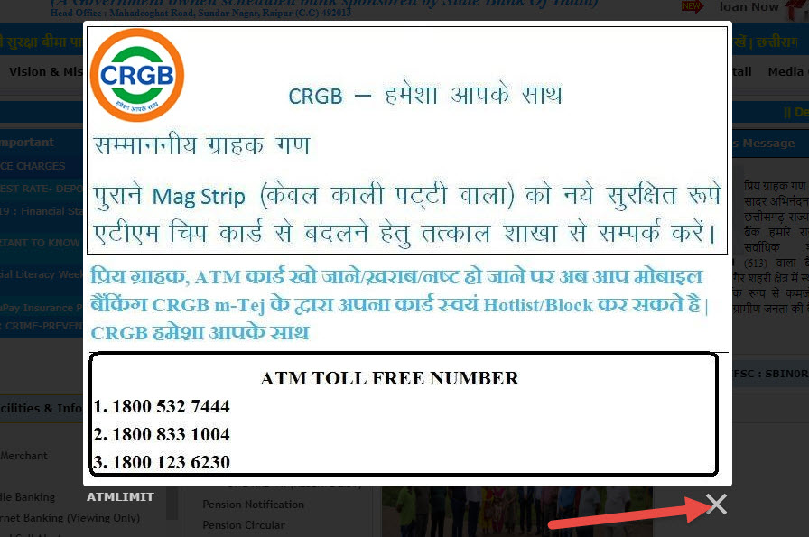 STEP 2. अब छत्तीसगढ़ राज्य ग्रामीण बैंक के वेबसाइट का होम पेज स्क्रीन पर खुल जायेगा ,इस पेज के खुलते ही एक पॉपअप स्क्रीन पर दिखाई देगा आपको उसे पढ़कर कट के निशान पर क्लिक करना होगा। या हो सकता है ,अब पॉपअप दिखाई न दे |