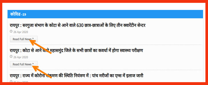 📌आज के समाचार -आज के समाचार पर क्लिक करते ही संबंधित तिथि को शासन द्वारा लिए गए निर्णय से संबंधित समाचार स्क्रीन पर शो होने लगेगा। read full news पर क्लिक कर पूरा समाचार पढ़ पाएंगे। जैसा कि आप स्क्रीनशॉट में देख पा रहे हैं ,आज छत्तीसगढ़ शासन ने सभी कलेक्टरों को ओला से फसल क्षति का आकलन करने तथा पीड़ितों को राहत पहुँचाने के निर्देश दिए हैं।