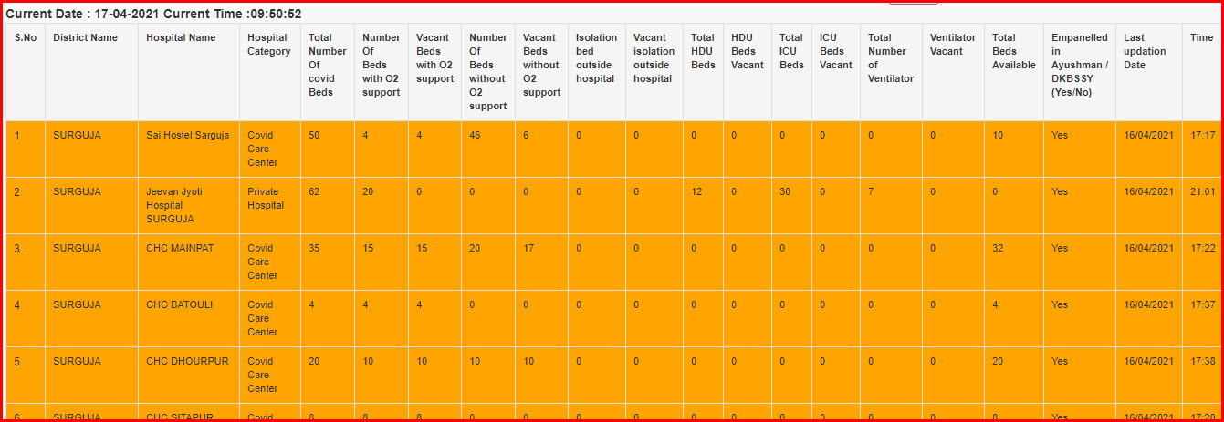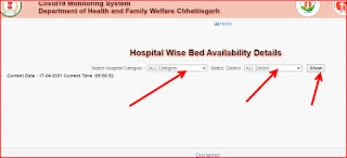 छत्तीसगढ़ शासन (NIC ) द्वारा कोरोना से जुड़ी जानकारी के लिए एक वेबसाइट तैयार किया गया है ,जिसके मदद से आप घर बैठे ही अस्पताल या जिलावार किस अस्पताल में कितना बेड खाली है की जानकारी प्राप्त कर सकते हैं | इस सुविधा के माध्यम से आप तिथि और समय के अनुसार किसी भी अस्पताल में रिक्त बेड की संख्या पता कर सकते हैं |