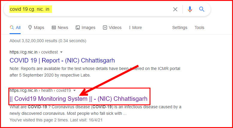 स्टेप 1. सबसे पहले आपको अपने एंड्राइड मोबाइल या लैपटॉप के ब्राउजर को ओपन करना है तथा उसके सर्च बार में covid-19 cg.nic.in या covid-19 monitoring system(NIC) chhattisgarh टाइप कर सर्च करना है ,जिससे कोरोना मॉनिटरिंग सिस्टम छत्तीसगढ़ का वेबसाइट स्क्रीन पर शो होने लगेगा | आपको स्क्रीनशॉट द्वारा दिखाए गये वेबसाइट पर क्लिक करना है |