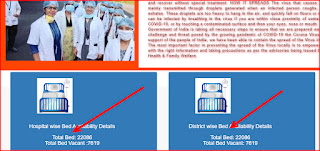 स्टेप 2 . अब वेबसाइट का होम पेज स्क्रीन पर शो होने लगेगा ,आपको इस पेज को स्क्रोल कर नीचे की ओर आना होगा ,जिससे आपको hospital wise bed availability details और district wise bed availability details का आप्शन दिखाई देखा | दोनों ही तरीके से रिक्त बेड की संख्या पता करने के तरीके बरी -बारी बताते हैं |