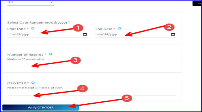 हम आपको इस आर्टिकल में पहले ही बता चुके हैं ,आप वर्तमान से पिछले छः महीने तक के 50 ऑथेंटिकेशन की जानकारी चेक कर सकते हैं इस लिए start date में पिछले छः माह के अंदर का डेट चयन करना है end date में आप आज का ही दिनांक चयन कर सकते हैं | इसके बाद number of records ( ऑथेंटिकेशन की संख्या ) में 50 दर्ज करना है |इसके बाद अंत में OTP दर्ज कर OTP/TOTP के नीले बटन पर टैब करना है |