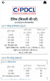 टैरिफ (बिजली की दरें )-इस सुविधा के माध्यम से पर यूनिट के लिए निर्धारित दर का पता लगाया जा सकता है। घरेलू कनेक्शन ,गैर घरेलू कनेक्शन ,कृषि ,उद्योग ,सार्वजनिक सुविधाएँ ,सूचना प्रौद्योगिकी उद्योग के लिए निर्धारित किये गए बिजली दर के बारे जानकारी प्राप्त किया जा सकता है।