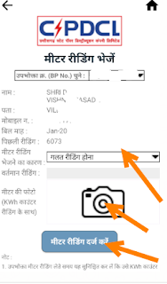 मीटर रीडिंग भेजें –मीटर रीडिंग सुविधा के माध्यम से आप घर बैठे ही ‘मीटर रीडिंग’ वितरण केंद्र में भेज सकते हैं ,जिससे प्रत्येक माह का सही -सही रीडिंग होता रहेगा। आपको मीटर का फोटो लेकर सेंड करना होगा। यह प्रक्रिया बहुत ही आसान है। जिससे पिछली रीडिंग और वर्तमान रीडिंग में आने वाले यूनिट के अंतर् का अंदाजा लगा सकते हैं।