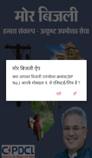 STEP 2.अब एप्प को open करना होगा ,इसके बाद स्क्रीन पर एक नोटिफिकेशन दिखाई देगा ‘क्या आपका बिजली उपभोक्ता क्रमांक (BP NO .)आपके मोबाइल नं.से रजिस्टर्ड /लिंक है ? यदि आपका मोबाइल नंबर और बिजली उपभोक्ता क्रमांक पहले से लिंक है तो हाँ पर क्लिक करना होगा। मोबाइल नम्बर ,उपभोक्ता क्रमांक से लिंक नहीं होने पर नहीं पर क्लिक करना होगा।