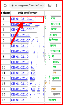 STEP 5.इस प्रकार आपके पंचायत में अंतर्गत जिन-जिन लोगों का जॉब कार्ड हैं उनका नाम जॉबकार्ड संख्या सहित शो होने लगेगा ,आप अपना या अपने परिवार के मुखिया का नाम देखे सकते हैं। यदि जॉब कार्ड में कार्य संबन्धित डिटेल देखना चाहते हैं तो उसके जॉबकार्ड संख्या पर क्लिक करना है।
