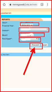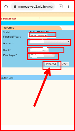 STEP 4. अब financial year ,district ,block ,panchayat सेलेक्ट करने का पेज खुल जाएगा। वर्ष ,जिला ,विकास खंड ,पंचायत सेलेक्ट करने के बाद proceed पर क्लिक करना है।